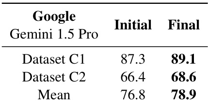 The authors evaluate the performance of Gemini 1.5 Pro using an optimized prompt template with image-only input. Results show that applying these refinements leads to performance gains across both tested business document datasets. The optimized prompt template improves performance for both Dataset C1 and Dataset C2. The mean performance increases following the application of the refined prompt strategy. The results demonstrate the effectiveness of the image-only approach when combined with enhanced instructions and schema adjustments.