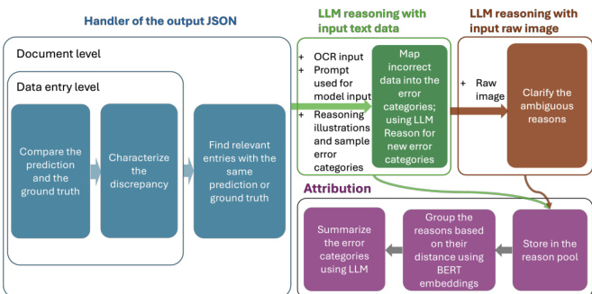 The final stage is the attribution module, which identifies the highest-level failure sources. The authors perform post-processing on the LLM-generated explanations by storing categorized reasons in a structured reason pool. To ensure coherent categorization, they apply BERT-based embedding clustering to group similar reasons based on cosine similarity. Representative keywords are then extracted for each cluster. This allows the framework to determine whether errors originate from specific root causes such as OCR misrecognition, layout misinterpretation, prompt misalignment, model capability limitations, or schema inconsistencies.