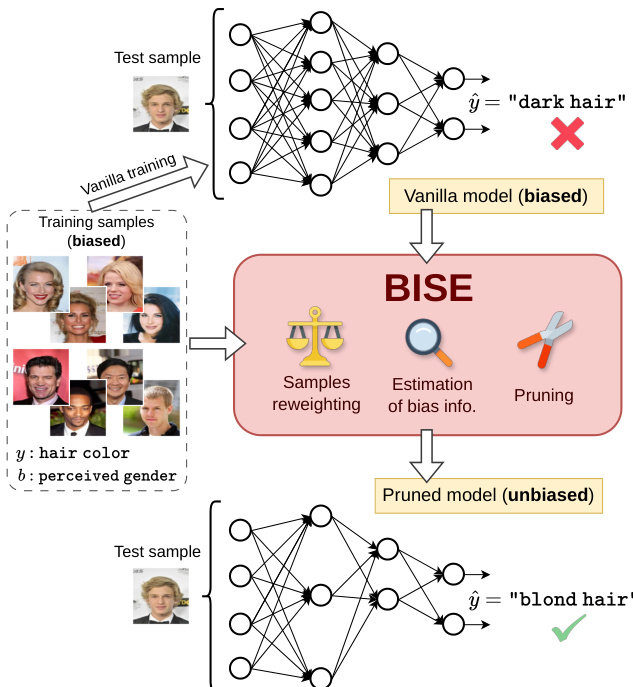 As shown in the figure, the process begins with a vanilla model trained on biased samples, which often fails on unbiased test cases due to reliance on spurious features. BISE intervenes through three core mechanisms: sample reweighting, estimation of bias information, and pruning. The goal is to find a subset of neurons within the original network that maintains accuracy on the target task while minimizing dependence on the bias attribute.