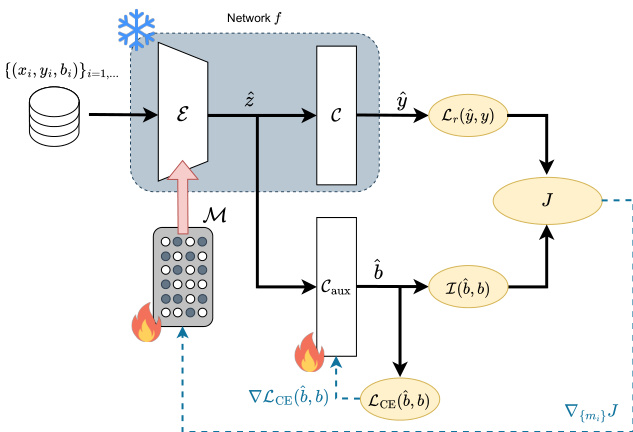 To optimize the mask, the authors define a composite objective function J that balances task performance and bias reduction: