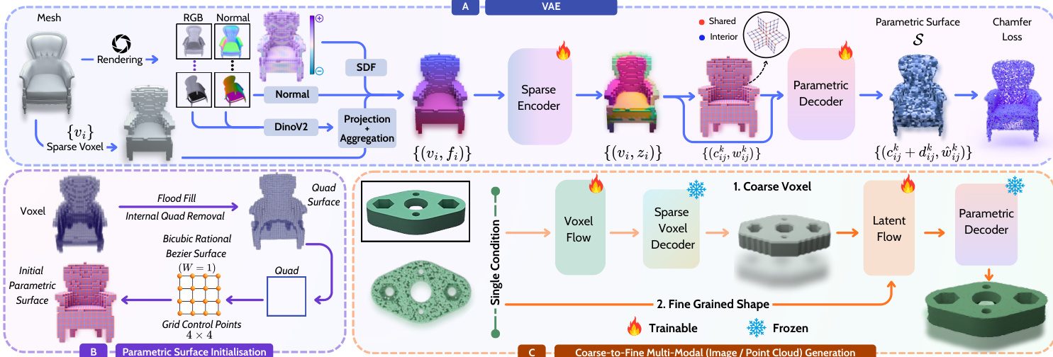 For conditional generation from text, images, or point clouds, DreamCAD adopts a two-stage flow-matching framework. In the first stage, a coarse voxel grid is generated from the input condition using a lightweight VAE. In the second stage, local features are generated for each active voxel, which are then transformed into the final parametric surface by the pretrained decoder.