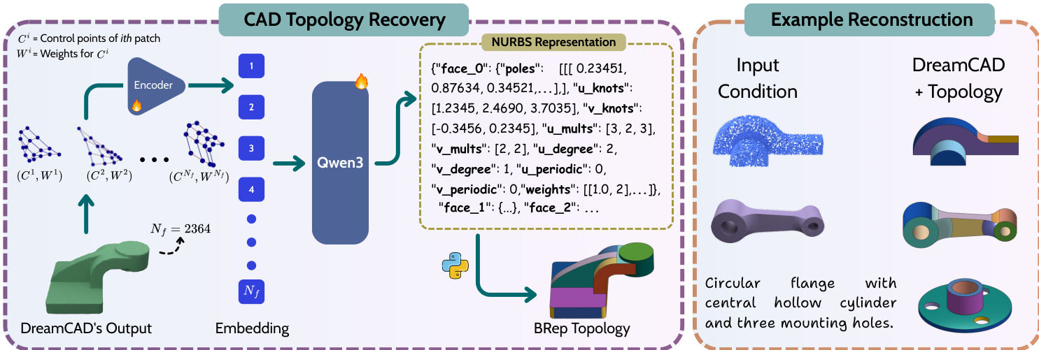 While the generative model produces a set of parametric patches, recovering the explicit CAD topology (BRep) remains a challenge. The authors introduce a post-processing module that leverages a large language model (Qwen3) to recover the topology. The control points and weights of the generated patches are embedded and fed into the model, which outputs a structured NURBS representation including face connectivity, poles, knots, and weights. This allows the final output to be converted into a standard CAD format.