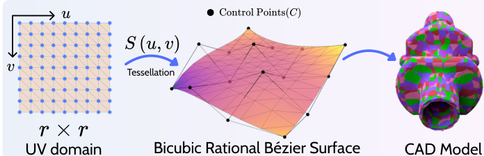 S(u,v)=∑i,iBin(u)Bim(v)wij∑i,jBin(u)Bjm(v)wijcijwhere B represents Bernstein basis functions. This formulation allows for differentiable mesh generation through tessellation, where the uv domain is sampled on a grid to form quadrilateral cells, which are then split into triangles.