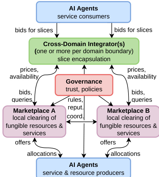 To ensure tractability in the presence of complex dependencies, the authors introduce a hybrid market architecture. As shown in the figure below, this architecture consists of three primary layers: Cross-Domain Integrators, Local Marketplaces, and AI Agents.