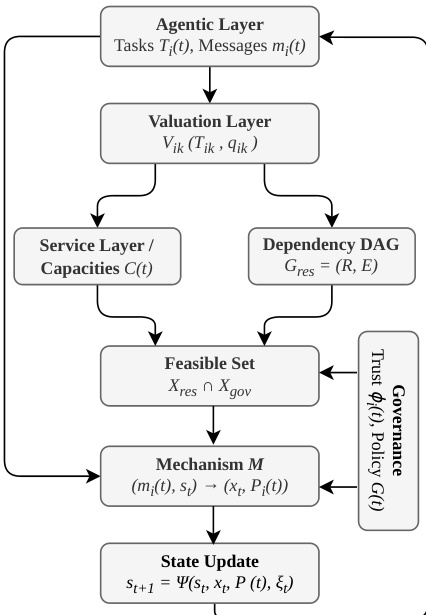 Concurrently, the Service Layer defines available capacities C(t), while the Dependency DAG models structural dependencies among resources as Gres=(R,E). These factors converge at the Feasible Set, which is the intersection of resource constraints Xres and governance constraints Xgov. Governance inputs, including trust scores ϕ(t) and policies G(t), further restrict the feasible allocations. The Mechanism M then maps the messages and current state to an allocation xt and payments Pi(t). Finally, the State Update module evolves the system state according to st+1=Ψ(st,xt,P(t),ξt), incorporating exogenous events and realized allocations.