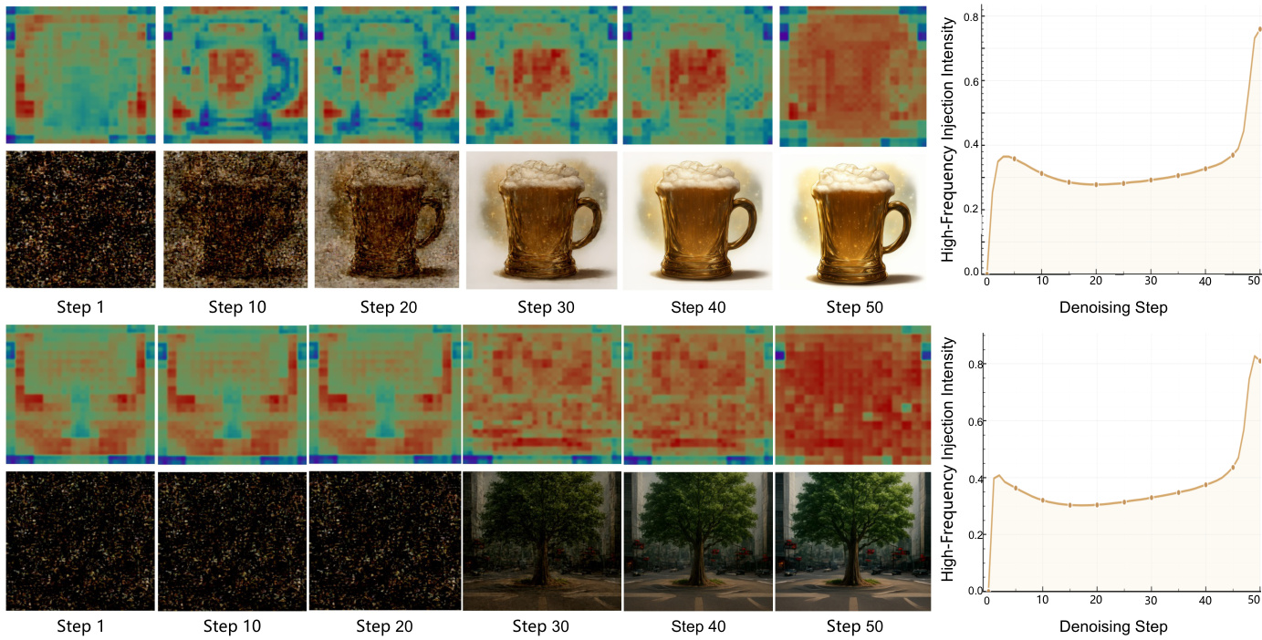 • Visualization of high-frequency injection reveals a dynamic, coarse-to-fine mechanism where high-frequency signals are sparsely used for initial contours but intensify in later stages to refine textures and local details.