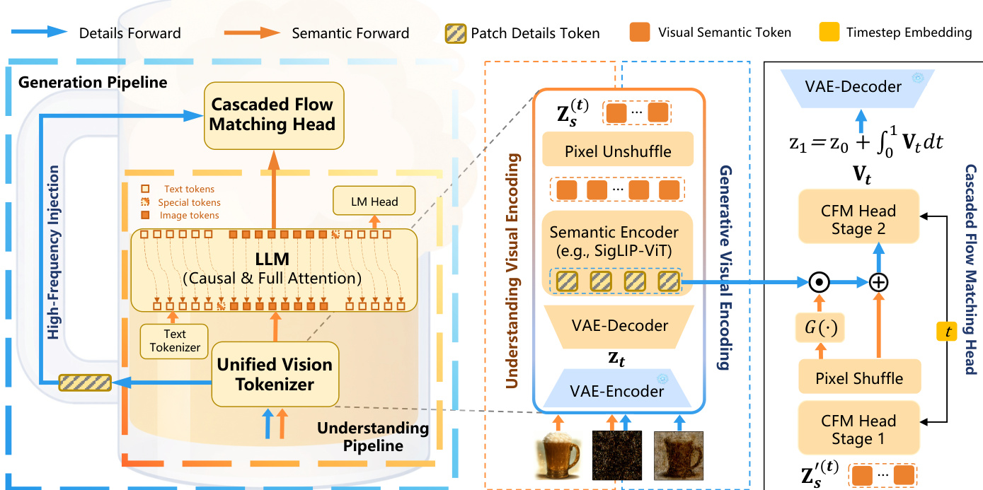 The core of the system relies on a Unified Vision Tokenizer, a Unified LLM-based Transformer, and a Cascaded Flow Matching Head. As shown in the figure below, the Unified Vision Tokenizer bridges latent representations and unified semantic visual embeddings. It comprises a VAE decoder and a semantic encoder, specifically SigLIP2-ViT. Given an input image X\mathbf{X}X, the VAE encoder yields latent states z1\mathbf{z}_1z1. To unify diverse tasks, a task-dependent latent zt\mathbf{z}_tzt is formulated as zt=tz1+(1t)z0\mathbf{z}_t = t\mathbf{z}_1 + (1 - t)\mathbf{z}_0zt=tz1+(1t)z0, where z0\mathbf{z}_0z0 represents latent noise. For visual understanding, ttt is fixed at 1, while for image generation, ttt is sampled from (0,1)(0, 1)(0,1). Instead of processing these latents directly, zt\mathbf{z}_tzt is passed through a VAE decoder to reconstruct the pixel-level image, which is then encoded by the ViT backbone to extract high-level semantic tokens zs(t)\mathbf{z}_s^{(t)}zs(t). This reconstruction step is crucial as it circumvents the loss of fine-grained features often associated with direct latent processing.