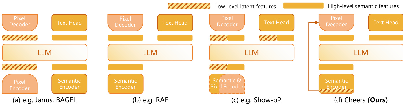 The authors present the CHEERS framework, which is designed to unify multimodal understanding and image generation through a specialized architecture. The design philosophy prioritizes the separation of feature granularities to handle the trade-off between semantic reasoning and pixel-perfect reconstruction. Refer to the framework diagram below which contrasts CHEERS with prior approaches such as Janus, BAGEL, and RAE. Unlike methods that process latent features directly or rely on a single encoder, the proposed architecture employs a dedicated Semantic Encoder for high-level features while maintaining a separate path for low-level latent features, ensuring that fine-grained details are not discarded during the encoding process.