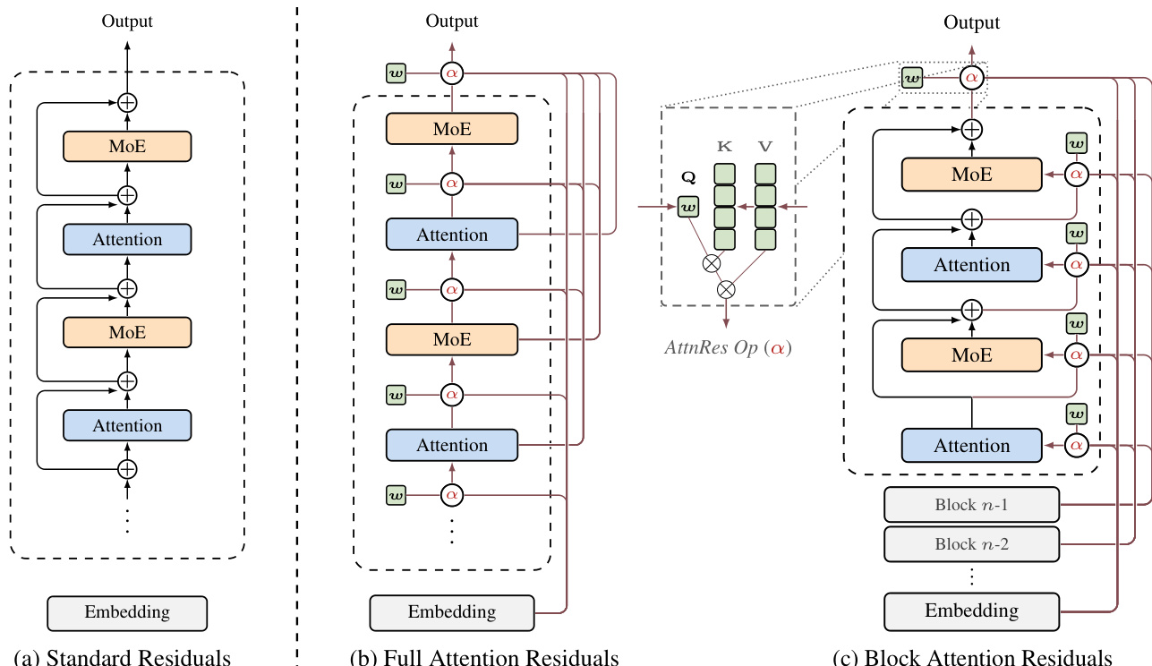 To make this approach scalable for large models, the authors introduce Block AttnRes (c). This variant partitions the L layers into N blocks. Within each block, layer outputs are reduced to a single representation via summation, and attention is applied only over the N block-level representations. This reduces the memory and communication complexity from O(Ld) to O(Nd). The intra-block accumulation is defined as bn=∑j∈Bnfj(hj), where Bn is the set of layers in block n. Inter-block attention then operates on these block summaries, allowing layers within a block to attend to previous blocks and the partial sum of the current block.
