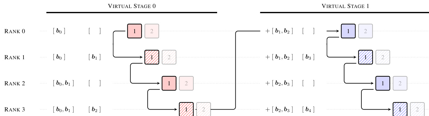 In this setup, blocks received during earlier virtual stages are cached locally. Consequently, stage transitions only transmit incremental blocks accumulated since the receiver's corresponding chunk in the previous virtual stage, rather than the full history. This caching strategy reduces the peak per-transition communication cost significantly, enabling the method to function as a practical drop-in replacement for standard residual connections with marginal training overhead. Additionally, a two-phase computation strategy is used during inference to amortize cross-block attention costs, further minimizing latency.
