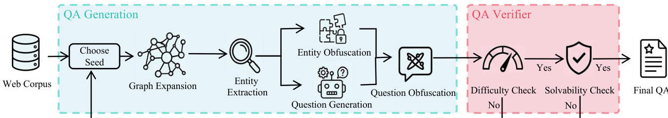 The process begins with the QA Generation module. To mimic natural information discovery, the system samples a seed node vseed from a web corpus and expands it by traversing outgoing edges to form a local dependency subgraph Gsub. This subgraph serves as a topologically-linked knowledge base. To reduce noise, an extraction function identifies a central theme ytheme and distills key entities into a condensed Entity Subgraph Gentity. A generator Pgen then synthesizes an initial question qinit conditioned on Gentity, enforcing a structural constraint where deriving the answer requires traversing multiple edges.