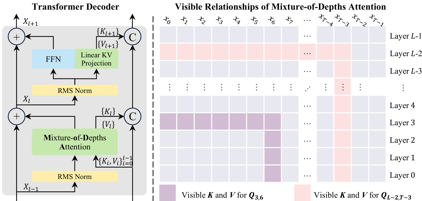 The architecture of the Transformer Decoder incorporating MoDA and the resulting visible relationships of the attention mechanism are shown below.