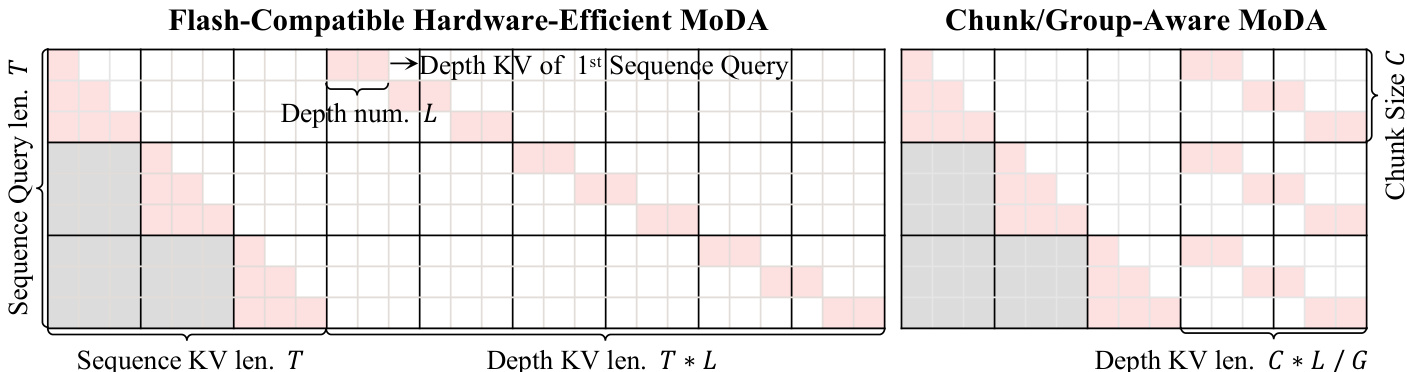 The Flash-Compatible layout flattens the depth cache along a single axis of length T×L, allowing each query to map to a contiguous depth range. However, to further improve depth utilization, the Chunk/Group-Aware layout groups queries by chunk size C. This reduces the effective depth span from T×L to (C×L)/G per chunk, where G is the Group Query Attention (GQA) group number. This reorganization minimizes unnecessary HBM traffic from masked, out-of-range depth entries and aligns query-block boundaries with G to simplify vectorized execution. The implementation follows an online softmax update process, accumulating logits from sequence and depth blocks into a single on-chip state before normalizing.