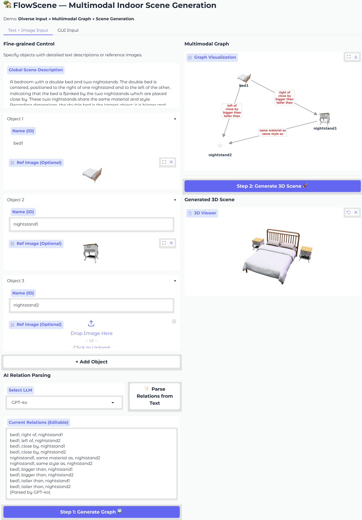 The system supports two primary application modes for user interaction. In the language-driven mode, users provide natural language descriptions which are parsed into a scene graph by an LLM. In the interactive GUI mode, users select object candidates and define relations through a visual interface. Both modes feed into the multimodal graph, which drives the FlowScene backend to generate a high-fidelity textured 3D scene consistent with the specified configuration.