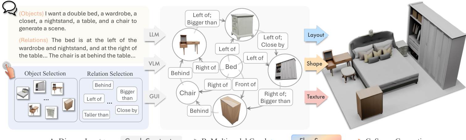 The process begins with the construction of a multimodal scene graph GM=(VM,E). Nodes in VM represent objects and can be text-only, image-only, or multimodal, aggregating learnable embeddings with foundation features from CLIP or DINOv2. Edges in E encode spatial and semantic relationships such as "left of" or "bigger than." An LLM or VLM parses user inputs to populate this graph, allowing for fine-grained control over the scene configuration.