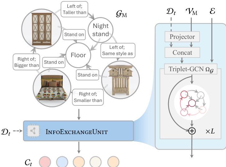 To generate the scene, the authors employ a Multimodal Graph Rectified Flow backbone. This module adapts rectified flow models to handle multiple content generation jointly. The core of this mechanism is the InfoExchangeUnit, which utilizes a Triplet-Graph Convolutional Network (Triplet-GCN) to perform message passing and feature aggregation across the graph edges. During the denoising process, this unit incorporates temporal denoising data Dt and projects it alongside node features to produce time-dependent conditions Ct. This ensures that the generation of each object respects the global constraints imposed by the graph structure.