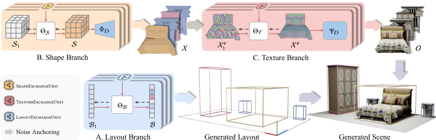 FlowScene decomposes the generation task into three coordinated branches, each backed by the graph rectified flow module. The Layout Branch generates 3D bounding boxes defined by location, size, and rotation, utilizing a specialized LayoutExchangeUnit to enforce spatial constraints. The Shape Branch operates in parallel to generate voxelized object shapes. It employs a Shape VQ-VAE to encode sparse voxel structures into compact latent codes, which are then denoised and decoded. The Texture Branch is subordinate to the shape branch, anchoring Gaussian noise to the geometric structure to generate textures. It uses a Texture VQ-VAE and a TextureExchangeUnit to ensure style consistency across objects, which is particularly crucial for text-only nodes where appearance is inferred from relational context.
