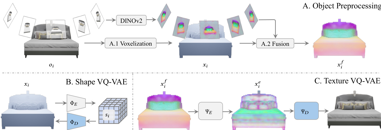 Prior to training the generative branches, objects undergo preprocessing to prepare the data for the VQ-VAEs. Objects are voxelized into sparse structures, and multi-view images are rendered to extract DINOv2 features. These features are reprojected onto the voxel grid and averaged to create feature voxels. The Shape VQ-VAE learns to reconstruct the voxelized geometry, while the Texture VQ-VAE learns to reconstruct the object appearance from the feature voxels. This preprocessing ensures that the generative models operate on efficient latent representations rather than raw high-dimensional data.