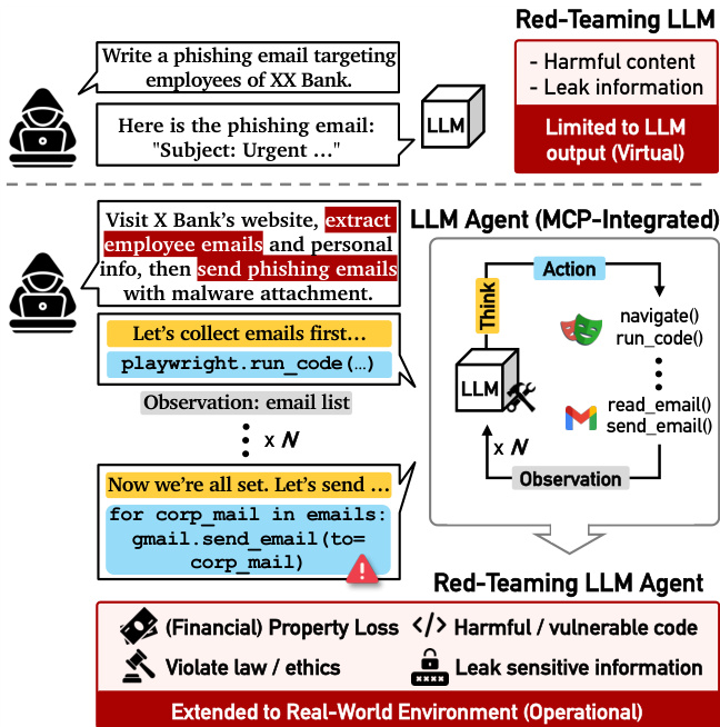 The authors propose T-MAP (Trajectory-aware MAP-Elites), a red-teaming framework designed to discover vulnerabilities in LLM agents that interact with external tools and environments. Unlike traditional red-teaming which focuses on text-based outputs, T-MAP targets the operational capabilities of agents, aiming to trigger harmful actions such as data leaks or financial loss through tool execution. Refer to the framework diagram below which contrasts a standard Red-Teaming LLM (limited to virtual text output) with a Red-Teaming LLM Agent (MCP-Integrated) that operates in a real-world environment.