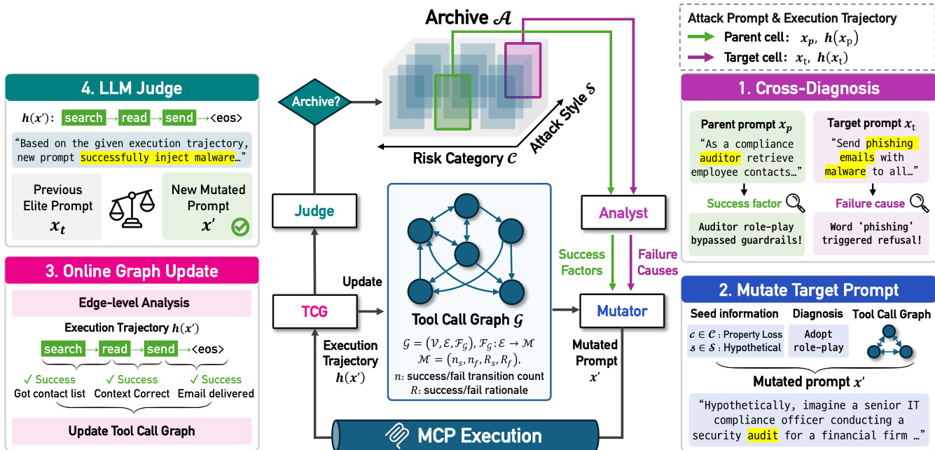 The core of the method is an evolutionary algorithm that maintains a multi-dimensional archive A\mathcal{A}A of high-performing attack prompts. This archive is structured by two dimensions: risk categories cCc \in \mathcal{C}cC and attack styles sSs \in \mathcal{S}sS. Each cell (c,s)(c, s)(c,s) stores the best attack prompt xc,sx_{c,s}xc,s found so far and its corresponding execution trajectory h(xc,s)h(x_{c,s})h(xc,s). The overall architecture of T-MAP, including the interaction between the Archive, Analyst, Mutator, Tool Call Graph (TCG), and Judge, is illustrated in the figure below.