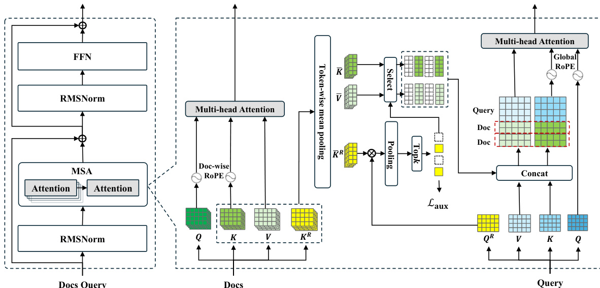 To efficiently process massive memory at the latent state level, MSA replaces the standard dense self-attention with a document-based retrieval sparse attention mechanism. Refer to the framework diagram below for the internal structure of the MSA layer.