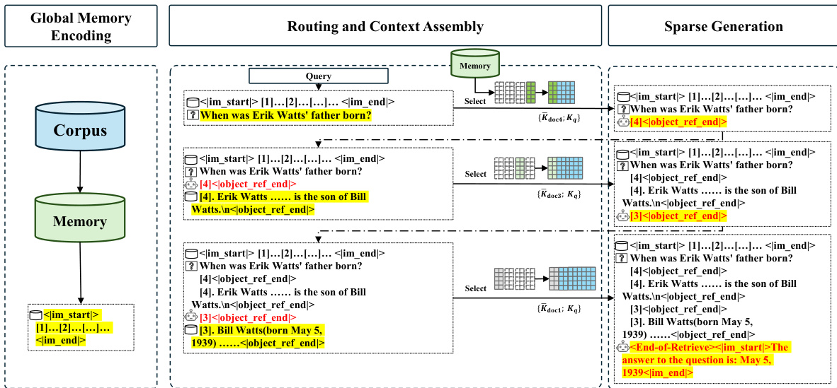 Formally, let the memory bank consist of a set of documents D={d1,d2,…,dN}. For each document di, the model generates standard Key Ki,h and Value Vi,h matrices via the backbone model's projection weights. In parallel, a Router K Projector generates a specialized routing key matrix Ki,hR: