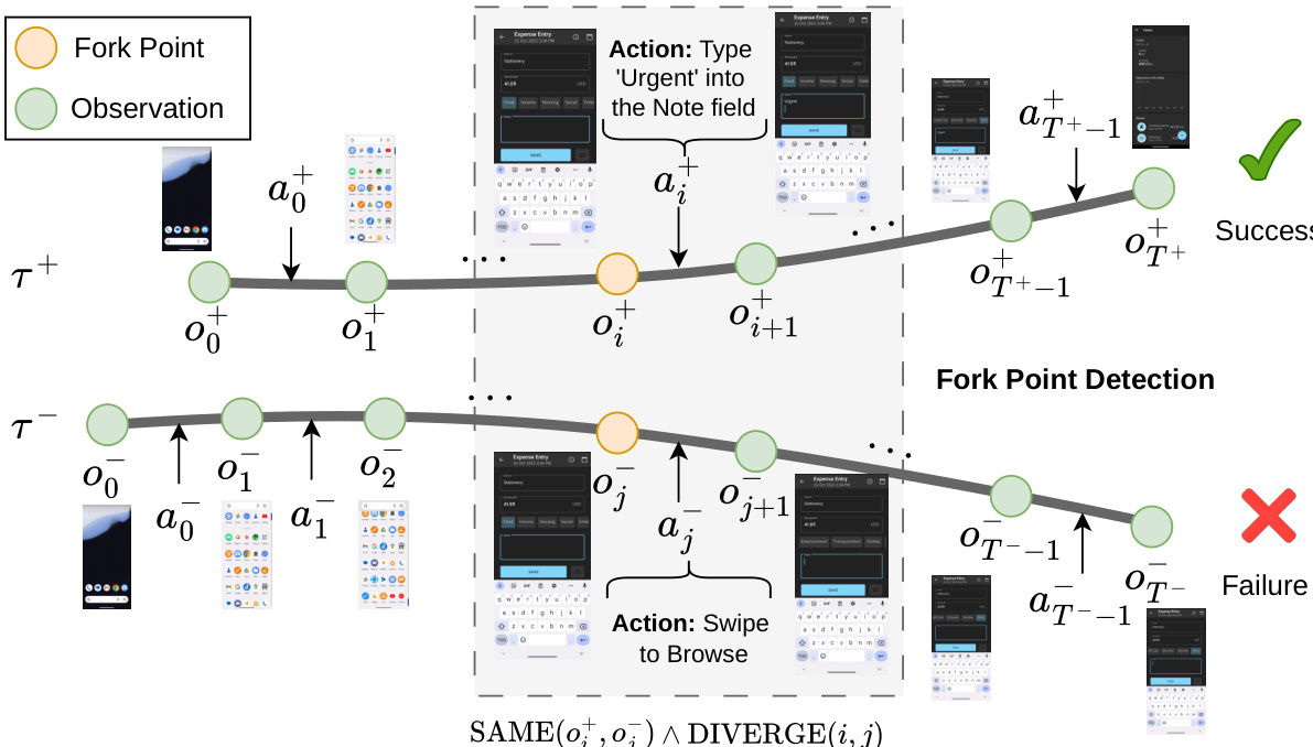 The core mechanism of GRSD is Fork Point Detection. Given a successful trajectory τ+\tau^{+}τ+ and a failed trajectory τ\tau^{-}τ, the system searches for steps where the agent observes the same screen state but takes different actions. To determine state equivalence, the authors utilize the Structural Similarity Index (SSIM) on preprocessed screenshots. A fork point is identified at step jjj in the failed trajectory if there exists a step iii in the successful trajectory such that the observations match, denoted as SAME(oi+,oj)\text{SAME}(o_{i}^{+}, o_{j}^{-})SAME(oi+,oj), but the subsequent transitions diverge, denoted as DIVERGE(i,j)\text{DIVERGE}(i, j)DIVERGE(i,j).