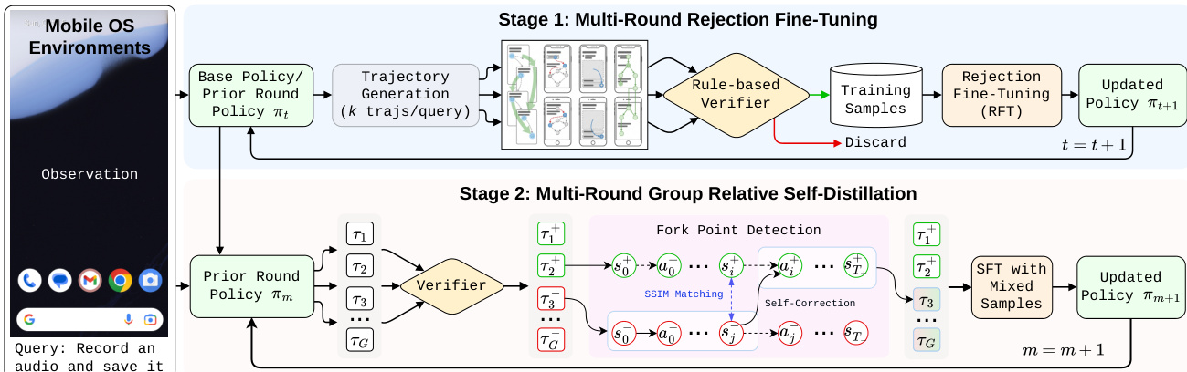 Autonomous mobile GUI agents are critical for enabling AI to navigate complex, dynamic smartphone interfaces, yet current approaches struggle with data inefficiency and ambiguous credit assignment when learning from sparse, trajectory-level rewards. Prior methods often discard failed interaction attempts and lack the precision to identify which specific steps caused a task failure, hindering stable policy optimization for long-horizon tasks. To address these issues, the authors introduce UI-Voyager, a self-evolving agent that employs a two-stage pipeline combining Rejection Fine-Tuning for autonomous data-model co-evolution and Group Relative Self-Distillation to generate dense, step-level supervision from successful trajectories to correct failed ones.