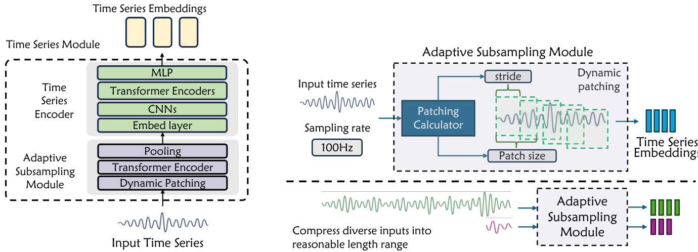 The architecture also includes a dedicated Time Series Module to handle diverse scientific data. This module features an Adaptive Subsampling Module that dynamically determines patch size and stride based on the signal and sampling rate. This allows the model to compress heterogeneous time series into a uniform representation space, handling sequences ranging from 100 to 106 time steps while preserving structural features.