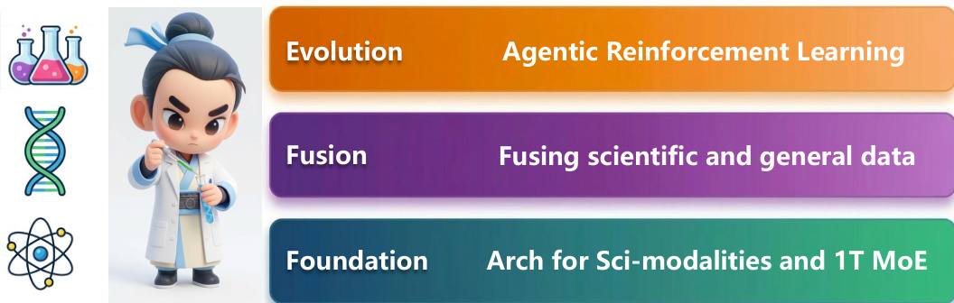 Training involves resolving conflicts between scientific and general data through strategies like Structured Scientific Data Transformation and System Prompt Isolation. Additionally, Stable Mixed-Precision Reinforcement Learning is implemented for the sparse MoE models, utilizing FP8 quantization for expert layers and FP32 for the language modeling head to ensure numerical fidelity and training stability.
