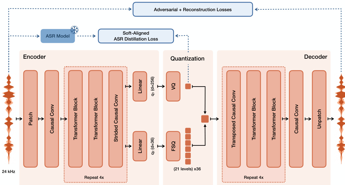 The authors introduce Voxtral TTS, which relies on a novel speech tokenizer called Voxtral Codec to discretize audio into semantic and acoustic tokens. The Codec architecture is detailed in the figure below. It processes 24 kHz mono waveforms through a convolutional-transformer encoder that projects input patches into embeddings. These embeddings pass through multiple blocks containing causal self-attention and causal CNN layers for downsampling. The resulting latent representation is split into a 256-dimensional semantic component and 36 acoustic dimensions, which are quantized independently. The semantic component uses Vector Quantization (VQ) with a codebook of size 8192, while the acoustic dimensions use Finite Scalar Quantization (FSQ) with 21 uniform levels. This hybrid scheme achieves a low bitrate of approximately 2.14 kbps. The decoder mirrors the encoder structure to reconstruct the waveform from these discrete tokens.