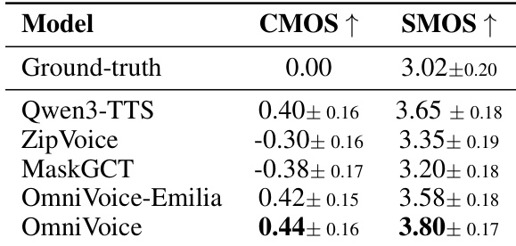 The authors conduct a subjective evaluation comparing OmniVoice and its variants against several state-of-the-art TTS models using CMOS and SMOS metrics. The results demonstrate that OmniVoice achieves superior performance in both relative speech quality and absolute speaker similarity. OmniVoice achieves the highest scores in both CMOS and SMOS among all tested models OmniVoice-Emilia outperforms existing NAR baselines in subjective quality and similarity The multilingual OmniVoice model shows competitive advantages in speaker similarity compared to other baseline models