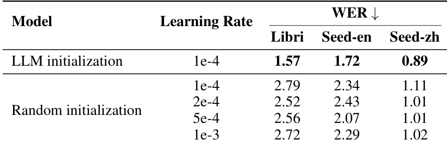 The authors evaluate the impact of LLM initialization on model intelligibility by comparing it against various random initialization configurations. Results show that models utilizing LLM initialization achieve lower word error rates across all tested datasets compared to those with random initialization. LLM initialization consistently yields better intelligibility than random initialization regardless of the learning rate used. The performance advantage of LLM initialization remains superior even after extensive learning rate tuning for the random initialization models. The benefit of inheriting linguistic knowledge from pre-trained LLMs is evident across English and Chinese benchmarks.
