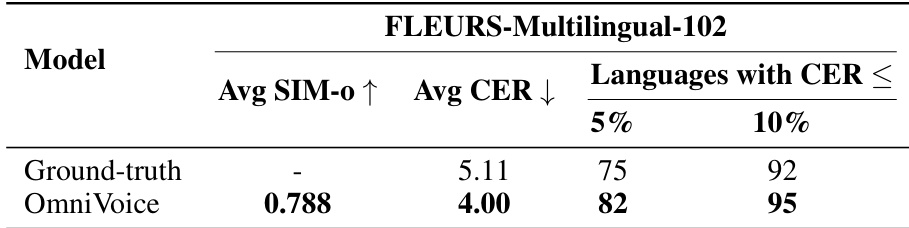 The authors evaluate OmniVoice on the FLEURS-Multilingual-102 benchmark to assess its multilingual capabilities. The results show that the model achieves high intelligibility and speaker similarity compared to the ground-truth reference. OmniVoice achieves a lower average character error rate than the ground-truth audio. The model demonstrates high intelligibility with a large number of languages meeting strict error rate thresholds. OmniVoice outperforms the ground-truth in the proportion of languages falling below both 5% and 10% character error rate limits.