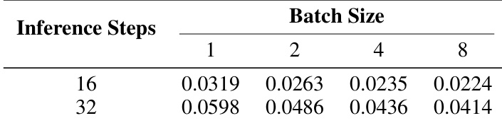 The authors evaluate the inference speed of OmniVoice by measuring the real-time factor across various inference steps and batch sizes. The results show that increasing the batch size reduces the real-time factor, indicating higher efficiency during batch inference. Larger batch sizes lead to a lower real-time factor across all tested inference steps Increasing the number of inference steps results in a higher real-time factor The model demonstrates improved inference efficiency when processing multiple samples simultaneously