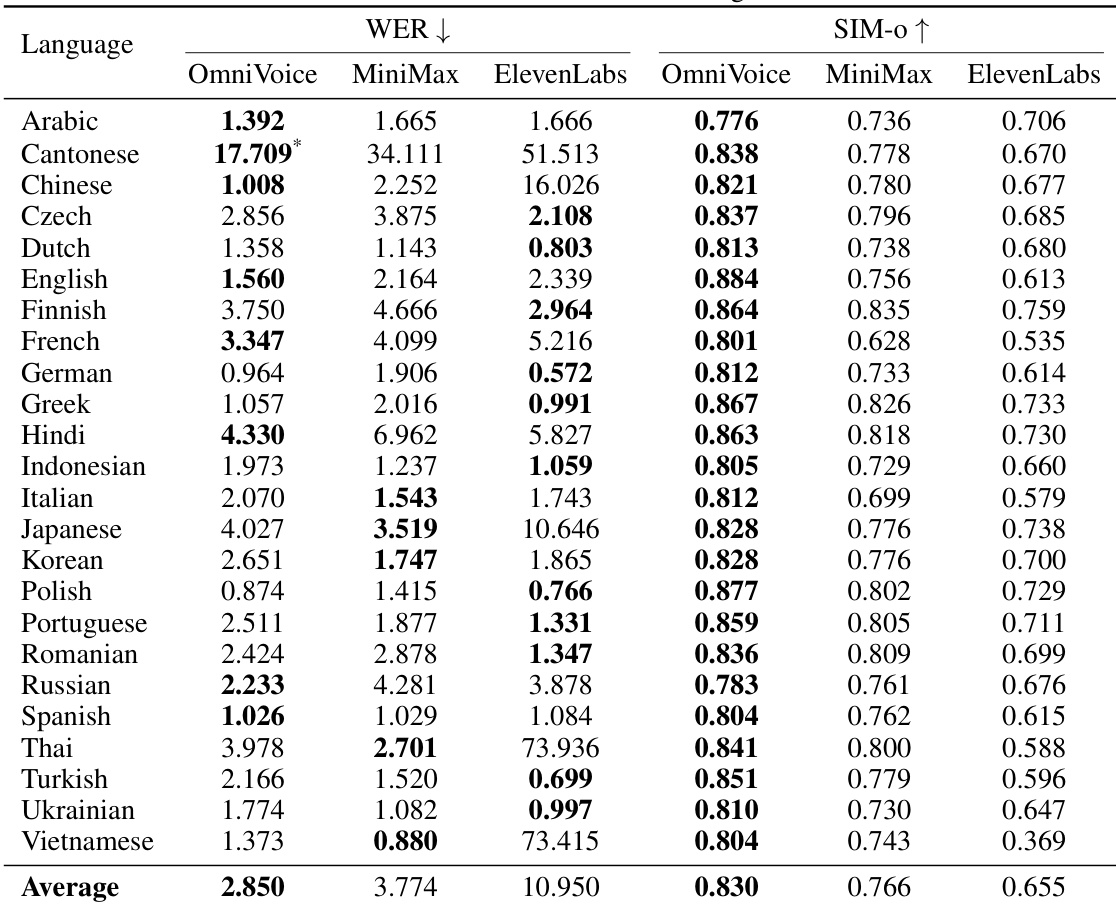 The authors compare OmniVoice against ElevenLabs across various languages using Word Error Rate (WER) and speaker similarity (SIM-o) metrics. The results demonstrate that OmniVoice achieves competitive or superior performance in both intelligibility and speaker similarity across a wide range of languages. OmniVoice achieves a lower average WER compared to ElevenLabs across the evaluated languages. The model shows higher average speaker similarity than the ElevenLabs baseline. OmniVoice maintains strong performance in both intelligibility and similarity across diverse linguistic groups.
