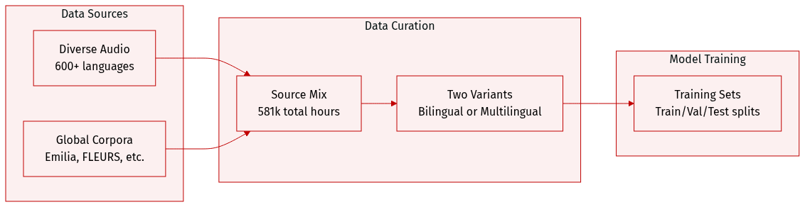 - Dataset Composition and Sources: The training data consists of a massive self-built multilingual corpus totaling 581,000 hours across more than 600 languages. This collection integrates a wide variety of sources, including Emilia, LibriTTS, Common Voice, VoxBox, Meta Omnilingual ASR Corpus, FLEURS, GigaSpeech 2, YODAS-Granary, and numerous regional datasets such as IndicVoices-R, Wenetspeech, and various Arabic and Tibetan corpora.