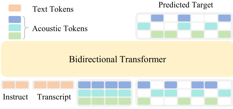 The model utilizes a bidirectional Transformer backbone, initialized with pre-trained LLM weights. Text tokens are processed through a text embedding layer, while acoustic tokens are processed via codebook-specific embedding layers. To integrate the multi-codebook information, the embeddings of all C codebooks at the same temporal position are summed into a unified embedding before being fed into the Transformer. On the output side, the model employs C independent, codebook-specific prediction heads that project the final hidden states to output probability distributions over the vocabulary for each corresponding codebook.