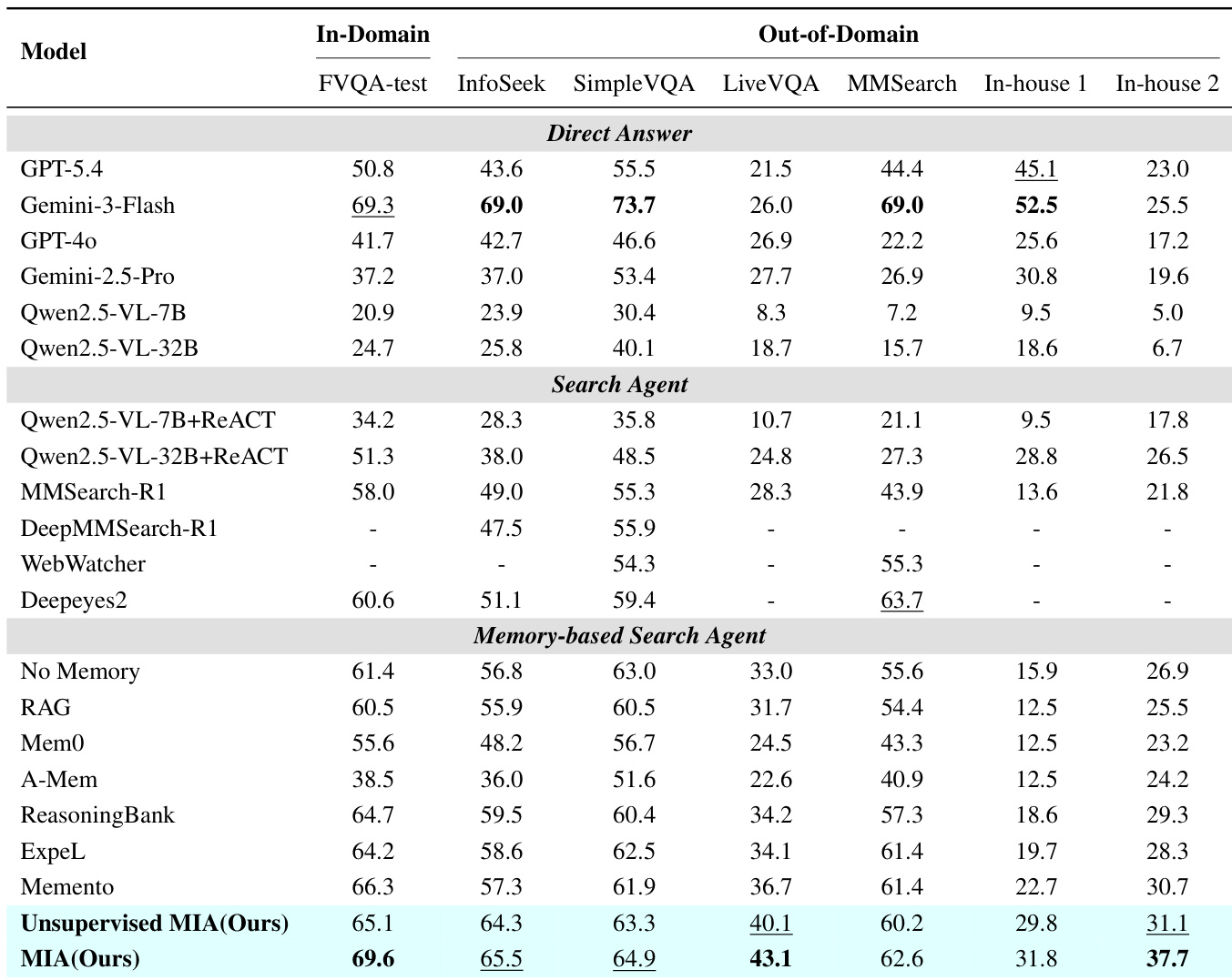 The authors evaluate their proposed MIA framework against direct answer models, search agents, and memory-based agents across multiple multimodal datasets. The results indicate that MIA achieves superior performance compared to most baselines, effectively bridging the gap in internalizing historical experiences better than contextual memory approaches. The proposed MIA model achieves top performance among open-source models and rivals the capabilities of leading closed-source systems like Gemini-3-Flash across various benchmarks. Contextual memory methods such as RAG and Mem0 generally underperform the No Memory baseline, suggesting that long memory contexts can introduce noise. The unsupervised variant of MIA demonstrates strong capabilities, achieving competitive results that approach the performance of the fully supervised version.