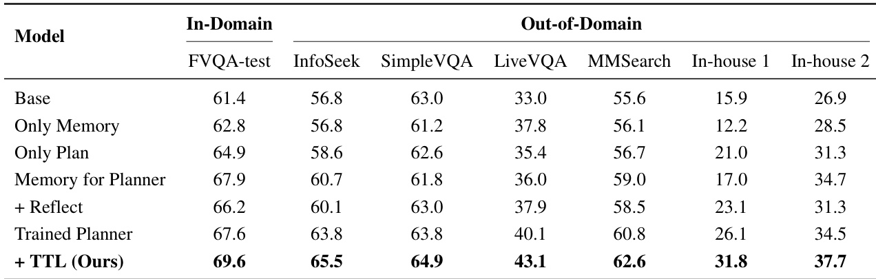 The authors conduct an ablation study to evaluate the contribution of individual components within their proposed framework on multimodal datasets. Results indicate that incrementally introducing modules such as memory-guided planning and test-time learning consistently enhances performance over the baseline. The complete system achieves the highest accuracy across all in-domain and out-of-domain benchmarks compared to intermediate variations. Integrating memory specifically to guide the planning process yields significant performance gains compared to using memory alone or a baseline without it. Training the planner component through alternating reinforcement learning provides substantial improvements over using a standard pre-trained planner. The full framework incorporating test-time learning outperforms all ablated versions across every evaluated dataset, demonstrating the effectiveness of the complete architecture.