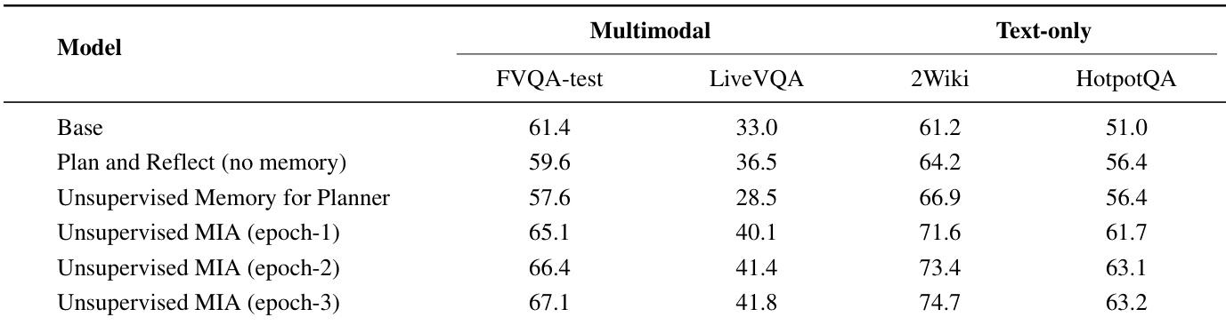 The the the table presents an evaluation of the Unsupervised MIA model across multimodal and text-only benchmarks, comparing its performance against Base and Plan and Reflect baselines. It specifically tracks the model's progress over three epochs of unsupervised self-evolution to demonstrate the effectiveness of the proposed method. The results indicate that the model consistently outperforms the baselines and shows steady improvements in accuracy as it undergoes more epochs of training. Unsupervised MIA achieves higher accuracy than the Base and Plan and Reflect models across all evaluated datasets. Performance demonstrates a consistent upward trend from epoch-1 to epoch-3, validating the effectiveness of the self-evolution mechanism. The model exhibits significant improvements on text-only reasoning tasks compared to the baseline configurations.