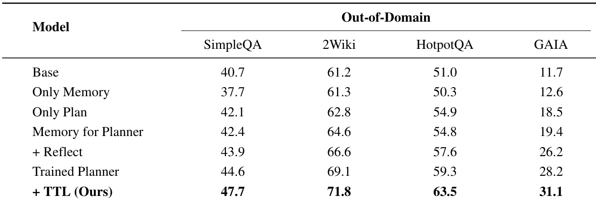 The the the table presents an ablation study evaluating the impact of specific architectural components on text-only out-of-domain reasoning tasks. Results show a consistent performance increase as the model integrates memory-guided planning, reflection, and test-time learning mechanisms. The complete framework outperforms all intermediate variants and the baseline across every dataset column. Guiding the planner with memory yields significantly better results than using memory or planning in isolation. Training the planner model through reinforcement learning leads to substantial performance gains over a standard pre-trained planner. The introduction of online test-time learning provides the final substantial improvement, securing the highest accuracy across all benchmarks.