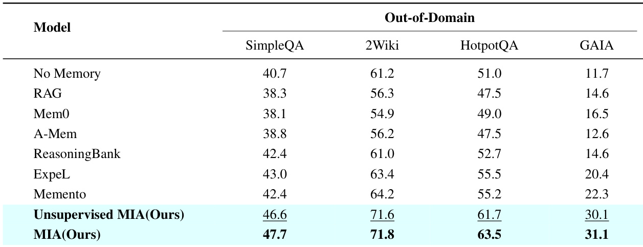 The the the table compares the proposed MIA model against various baselines on text-only out-of-domain datasets including SimpleQA, 2Wiki, HotpotQA, and GAIA. MIA demonstrates superior performance across all metrics, while traditional contextual memory methods often lag behind the no-memory baseline. The results validate the effectiveness of MIA's architecture in handling complex reasoning tasks without degrading performance. MIA consistently outperforms all baseline models including Memento and ExpeL across SimpleQA, 2Wiki, HotpotQA, and GAIA. Contextual memory methods such as RAG and Mem0 generally underperform the no-memory baseline, indicating potential noise introduction. The unsupervised variant of MIA achieves competitive results, closely approaching the performance of the supervised version.