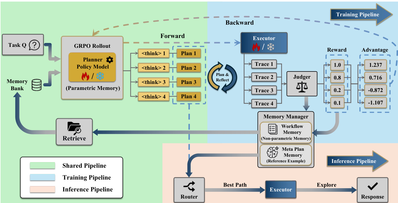 To optimize the collaboration between the Planner and Executor, the authors propose a two-stage alternating Reinforcement Learning (RL) training strategy based on Group Relative Policy Optimization (GRPO). In the first stage, the Planner is frozen while the Executor is trained to understand and follow plans. In the second stage, the Executor is frozen, and the Planner is optimized using memory contexts to enhance plan generation and reflection capabilities. The training pipeline, including the forward rollout and backward reward calculation, is illustrated below.