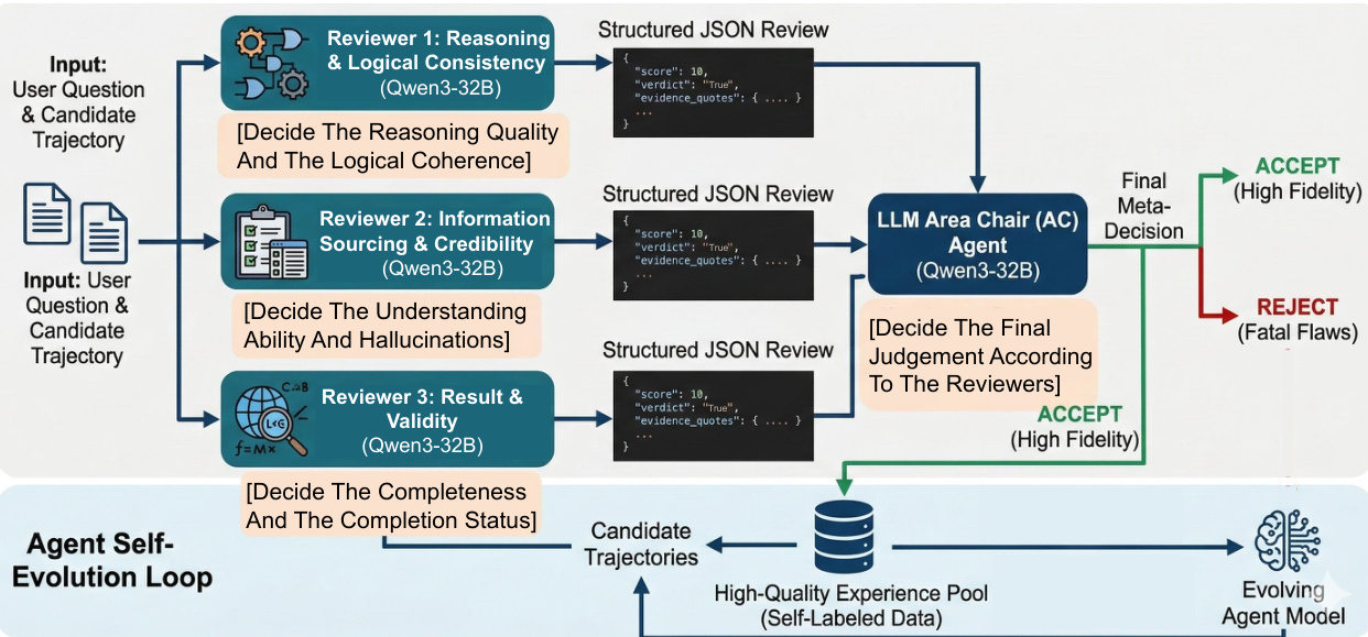 During Test-Time Learning (TTL), MIA adopts an online learning paradigm that performs exploration, storage, and learning simultaneously. This mechanism allows the agent to update its parametric memory (Planner parameters) and non-parametric memory (Workflow Memory) without interrupting the reasoning workflow. In unsupervised environments where ground-truth answers are unavailable, the framework employs a novel evaluation mechanism that mimics the peer-review process. This involves specialized reviewers for reasoning, information sourcing, and result validity, overseen by an Area Chair agent to ensure robust self-evolution. This unsupervised evaluation framework is depicted below.