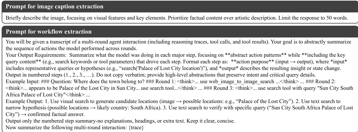 - Public Evaluation Sets: They utilize FVQA-test (1,800 examples), InfoSeek (2,000 examples), SimpleVQA (1,013 examples), and MMSearch (171 examples) as held-out benchmarks. For LiveVQA, they use the accessible public version with 2,384 examples instead of the deprecated 3,602-example version.