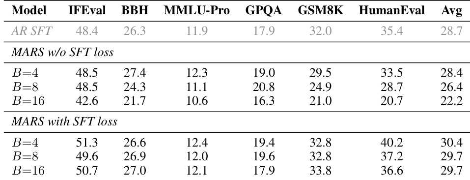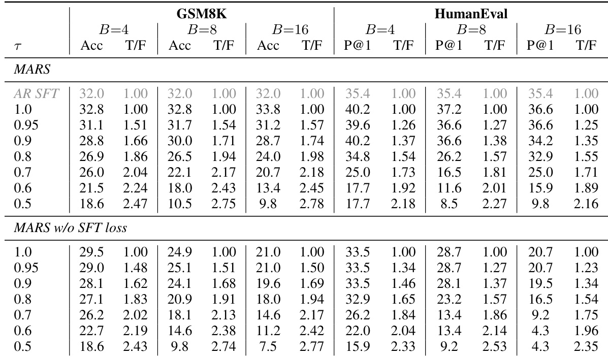 The the the table compares MARS performance with and without the SFT loss across different confidence thresholds and block sizes. Results show that MARS with the SFT loss maintains higher accuracy and smoother speed-quality tradeoffs compared to the variant without the SFT loss, especially as block size increases. The presence of the SFT loss stabilizes performance across varying generation speeds. MARS with the SFT loss achieves higher accuracy than without the SFT loss across all thresholds and block sizes. The accuracy drop with multi-token generation is small and predictable when using the SFT loss. Performance degrades significantly without the SFT loss as block size increases, indicating the loss's importance for stability.