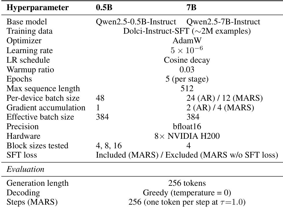 The authors compare the training setup for MARS across two model scales, 0.5B and 7B, highlighting differences in hardware, block sizes, and the inclusion of the SFT loss. The evaluation uses greedy decoding with a maximum generation length of 256 tokens, and MARS is configured to generate one token per step at a threshold of 1.0. The 7B model uses NVIDIA H200 hardware and a block size of 4, while the 0.5B model uses 4, 8, and 16 block sizes. The SFT loss is included for the 0.5B model but excluded for the 7B model in the tested configurations. Both models use a learning rate of 5e-6 and are trained for 5 epochs per stage with a maximum sequence length of 512 for the 7B model and 48 for the 0.5B model.