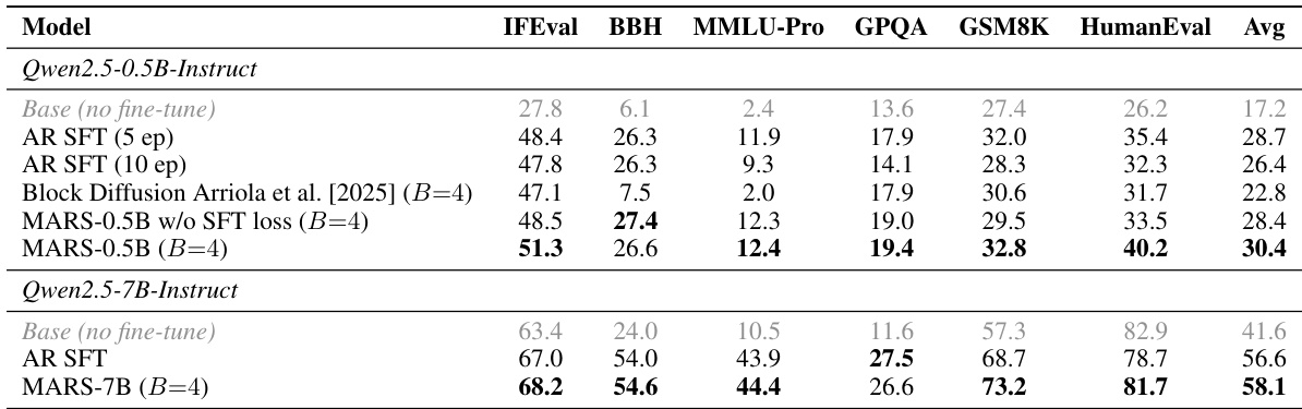 The authors evaluate MARS under one-token generation mode to assess its ability to preserve the quality of the original autoregressive (AR) model. Results show that MARS maintains or improves performance across multiple benchmarks compared to the AR SFT baseline, with significant gains observed on reasoning and coding tasks. The inclusion of the SFT loss is critical, as its absence leads to substantial performance degradation with larger block sizes. MARS maintains or improves performance over AR SFT on reasoning and coding tasks with one-token generation Without the SFT loss, larger block sizes cause significant quality degradation across benchmarks The SFT loss stabilizes performance across block sizes, ensuring consistent quality regardless of block size