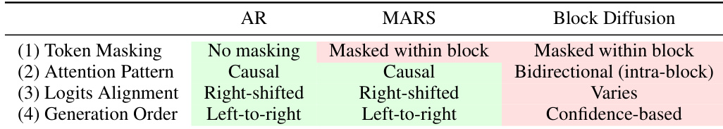 The the the table compares different generation methods across four criteria: token masking, attention pattern, logits alignment, and generation order. MARS uses causal attention and left-to-right generation similar to AR, but with masked token prediction within blocks, while Block Diffusion uses bidirectional attention and confidence-based generation. MARS uses causal attention and left-to-right generation like AR, but with masked token prediction within blocks Block Diffusion uses bidirectional intra-block attention and confidence-based generation MARS maintains right-shifted logits alignment similar to AR, unlike Block Diffusion which varies